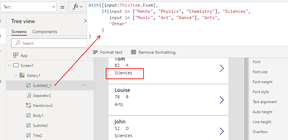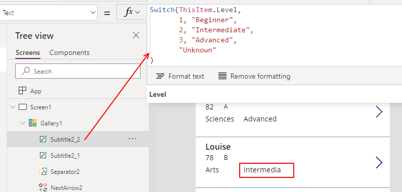 )With this formula, we substitute 'input' with the actual input value that we want to use. As an example, the screenshot beneath illustrates how we would refer to ThisItem.Score from a gallery control.