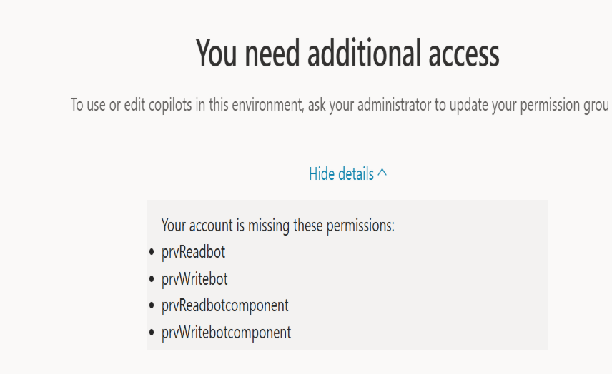 When navigating to https://copilotstudio.microsoft.com, an error message appeared showing the following missing permissions - `prvReadbot`, `prvWritebot`, `prvReadbotcomponent`, `prvWritebotcomponent`, and `prvReadSolution`.