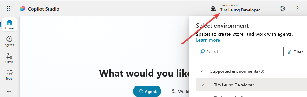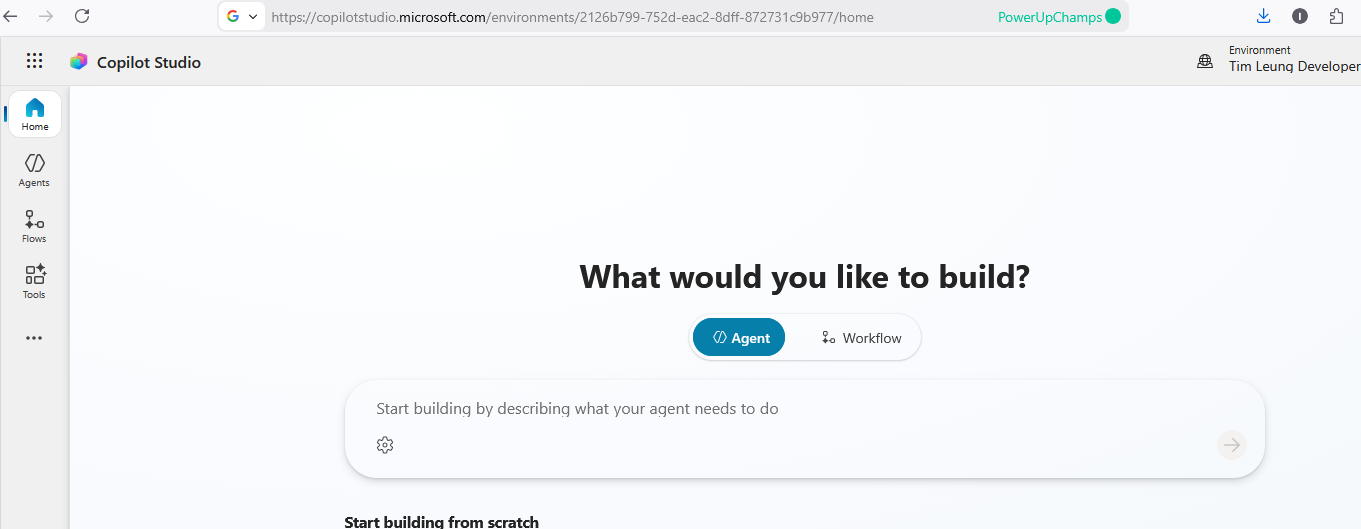 This should then successfully open Copilot Studio, as shown below.