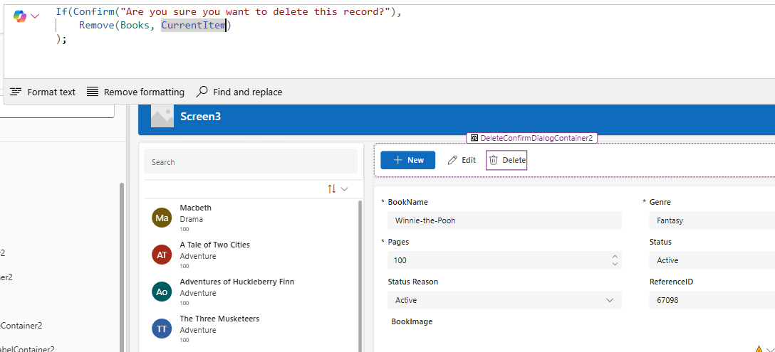 Clicking the Confirm button will now call the Remove function to delete the record.