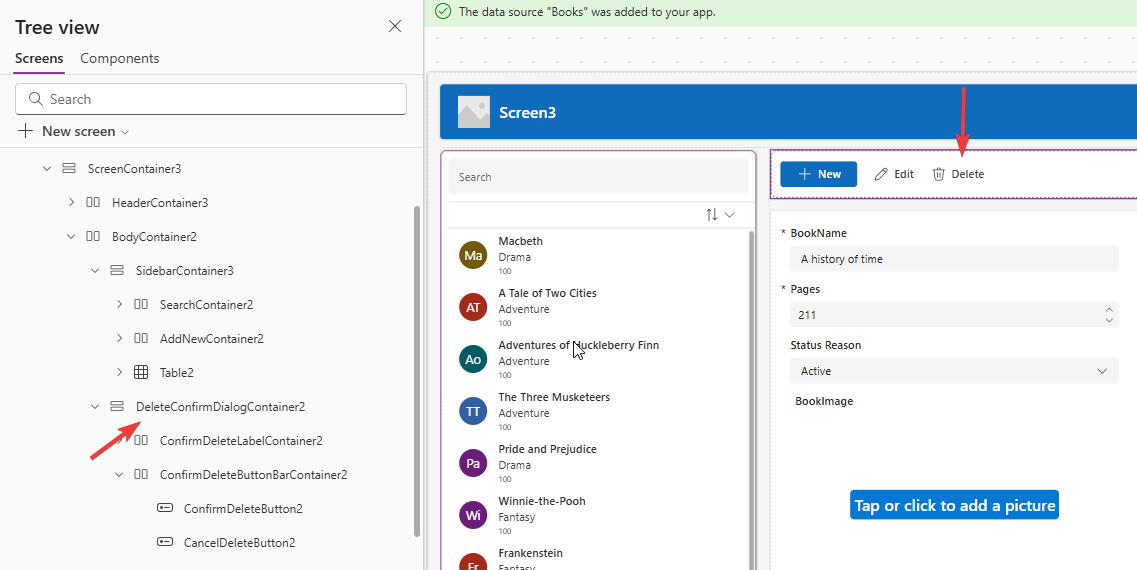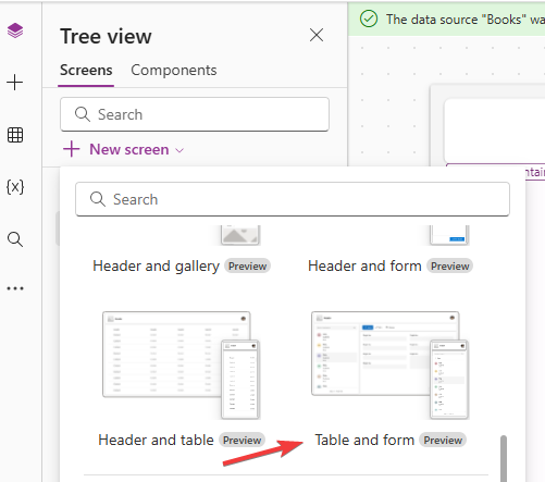 After creating this screen, I set the data source of the table and form controls to a Dataverse table called 'Books'.
