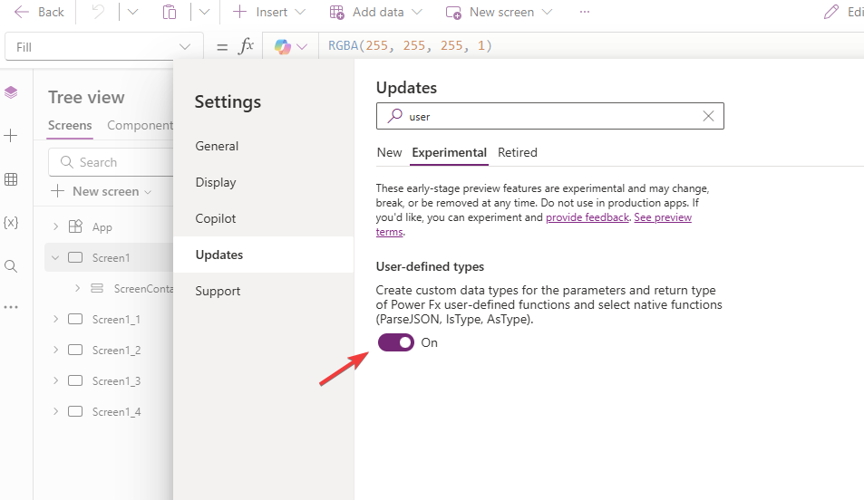 In the Settings of the app, select the Updates > Experimental and Search for User-defined types. Enable this option, and save/restart Power Apps Studio to apply the changes.
