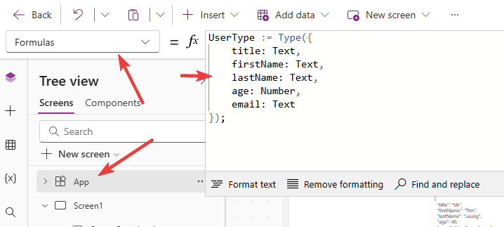 To work with this data, we'll need to define a UDT that represents this schema in the Formulas property in the App node.